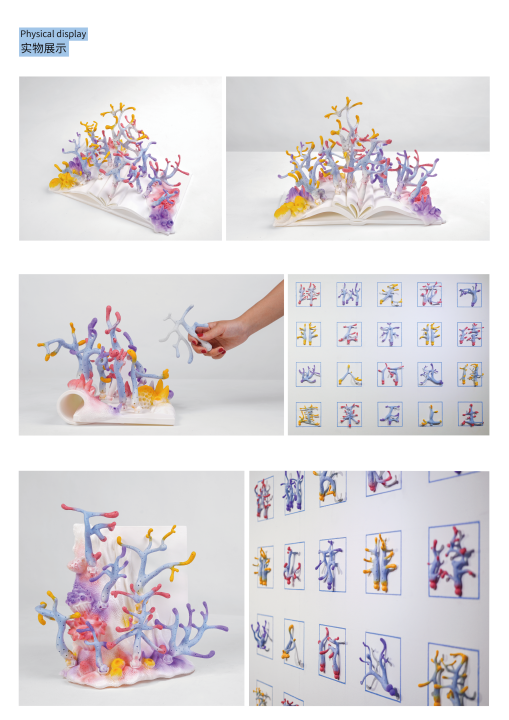 数字设计以多元创意形式,为生物多样性保护主题搭建了从专业研究到大众传播、从行业实践到校园教育的转化通道,让生命教育更具感染力、传播力与影响力。以海洋生态主题创意设计作品《字海礁语》为例,该作品以珊瑚礁海洋生态系统为核心,将创意字体设计与珊瑚生长形态深度融合,系统讲述海洋生态保护的科普故事。作品以海洋珊瑚白化、物种消亡的生态现状为创作背景,将汉字笔画解构重构为珊瑚的生长形态,通过色彩渐变精准呈现珊瑚从健康到白化的完整过程,让观众在视觉冲击中直观感受到海洋生态保护的紧迫性。在科普转化过程中,作品同步配套解读了珊瑚礁生态系统的生态价值、珊瑚白化的科学原理、海洋生物多样性保护的现实意义,让设计作品成为海洋自然教育的轻量化传播载体,实现了艺术表达、科普价值与育人价值的有机统一。
