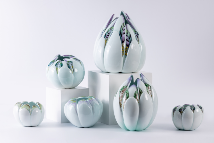 以传统生态文化主题设计作品《静露》为例,该作品以荷花这一经典湿地自然意象为核心,完成了传统自然智慧的现代设计表达。创作者首先对荷花花瓣的曲线、层次、生长节奏进行科学提取与抽象转化,将其拆解为可量化的几何参数——曲率半径、叠压角度、空间比例;随后构思一系列“含苞待放”的动态结构原型,再经过手工修坯与釉彩绘制,最终定型打造出兼具生长感与空间感的陶瓷器物。作品既保留了中国传统审美中“出淤泥而不染”的荷文化意象,传递了传统生态观中人与自然和谐共生的核心理念,也通过参数化设计与传统古彩工艺的结合,让观众在器物中感知水生植物的生长规律,理解传统工艺中蕴含的自然观察智慧。